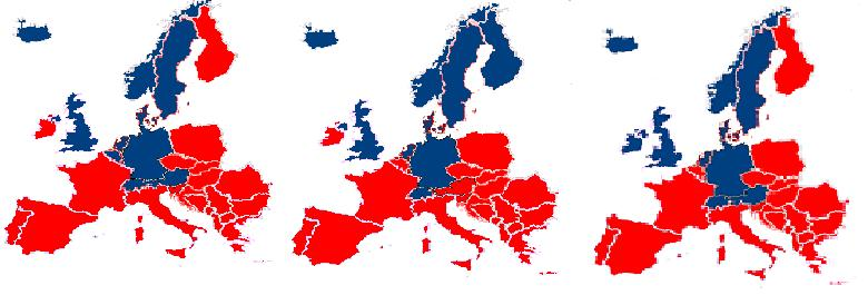 From left to right: The european countries painted blue are those with Germanic majority, those with large numbers of protestants (>45% of all believers), and those where communists electoral vote failed to rise above 10% within the last 60 years.