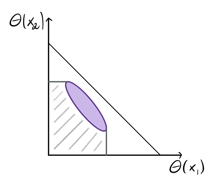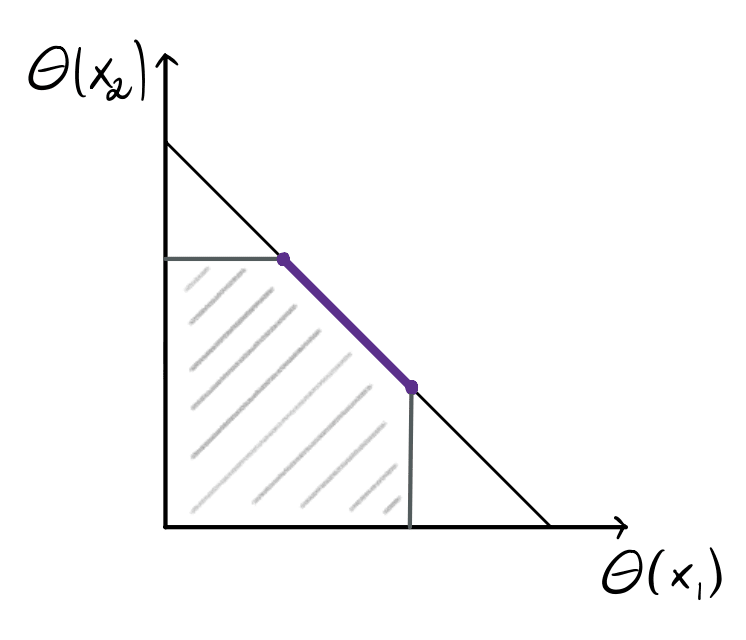 Figure 4: (Purple line segment) A credal set Θ on X={x1,x2}, and (gray shaded region) the supracontribution τ(Θ)=Θ↓.