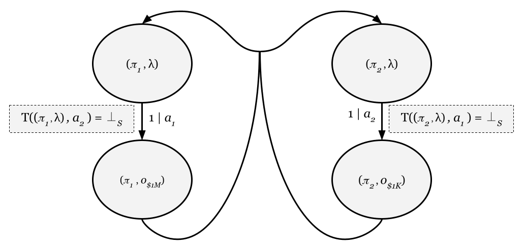 T((π1,λ),a1)={δ(π1,o$1M)}↓,T((π1,λ),a2)=⊥S,T((π2,λ),a2)={δ(π2,o$1K)}↓,T((π2,λ),a1)=⊥S, andT((π1,o$1.001M),⋅)=T((π2,o$1K),⋅)=ch(δ(π1,λ),δ(π2,λ))↓=⊤ΠH×λ.Figure 5 shows the state transition graph of Mν. Notably, it is not possible under Mν for an agent to two-box when Box B is full (the left branch in Figure 5). This is assured by the fact that T((π1,λ),a2)=⊥S.