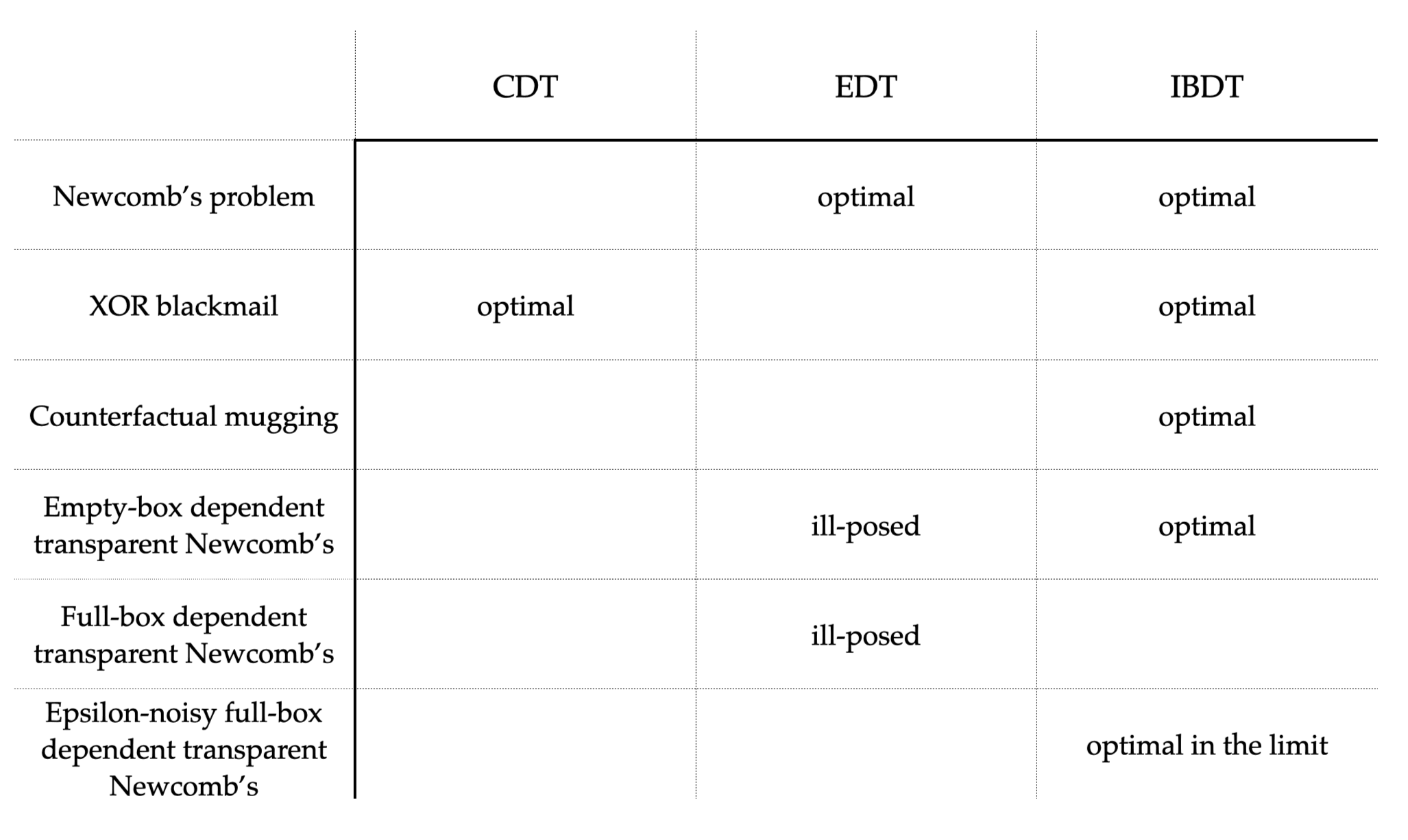 Figure 11: Table indicating for which problems CDT, EDT, and IBDT make optimal recommendations. For readability, a blank entry indicates that the recommendation is not optimal. Note that EDT is ill-posed when it involves conditioning on a probability zero event. The only example where IBDT fails to be optimal or optimal in the limit does not satisfy pseudocausality.