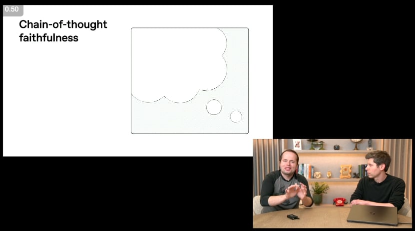 11.30. Value alignment is a hard problem. Definitely not solved yet. However there is a new promising tool that aids our study. That is CoT faithfulness. Something we invest in very heavily. Starting with our first reasoning models, we are pursuing this new direction in interpretability. The idea is to keep parts of the models internal reasoning free from supervision. So don’t look at it during training. Just let it be representative of the model’s internal process. So we refrain from guiding the model to think ‘good thoughts’ and so let it remain a bit more faithful to what it actually thinks. This is not guaranteed to work of course. We cannot make mathematical proofs about deep learning. So this is something we study. There are two reasons to be optimistic. One reason is that we have seen that promising empirical results. This is technology we have employed a lot internally. We use this to understand how our models train, how they’re propensities evolve over training. Also we have had successful external collaborations on investigating the model’s propensity to scheme, for example. Secondly, it is scalable. In the sense that, we make the scalable objective not adversarial to our ability to monitor the model. And of course objective not being adversarial to the ability to monitor the model is only half the battle. Ideally you want it to get it to help with monitoring the model. This is something we’re researching quite heavily. One important thing to underscore is that it is somewhat fragile. It really requires drawing this clean boundary and having this clear abstraction and having restraint in what ways we can access the CoT. This is present in algorithm design to how we design our products. E.g. if you look at CoT summaries in ChatGPT, if we didn’t have summariser and just made the CoT fully visible, that would it make it part of the overall experience and would make it very difficult to not be part of supervision.