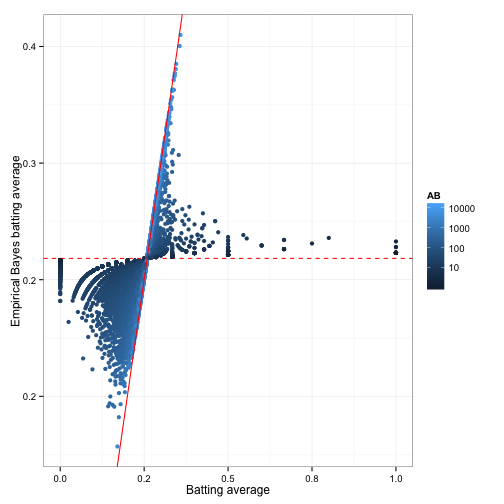 Understanding “empirical Bayes estimation” (using baseball statistics): Given two baseball batters, one which has hit 4 out of 10 balls, and another one which has hit 300 out of 1000 balls, which one is, in expectation, better?