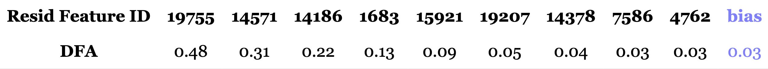 As argued in our initial post, each feature activation is a sum of contributions from each head. We call the decomposition into per-head scores direct feature attribution (DFA).