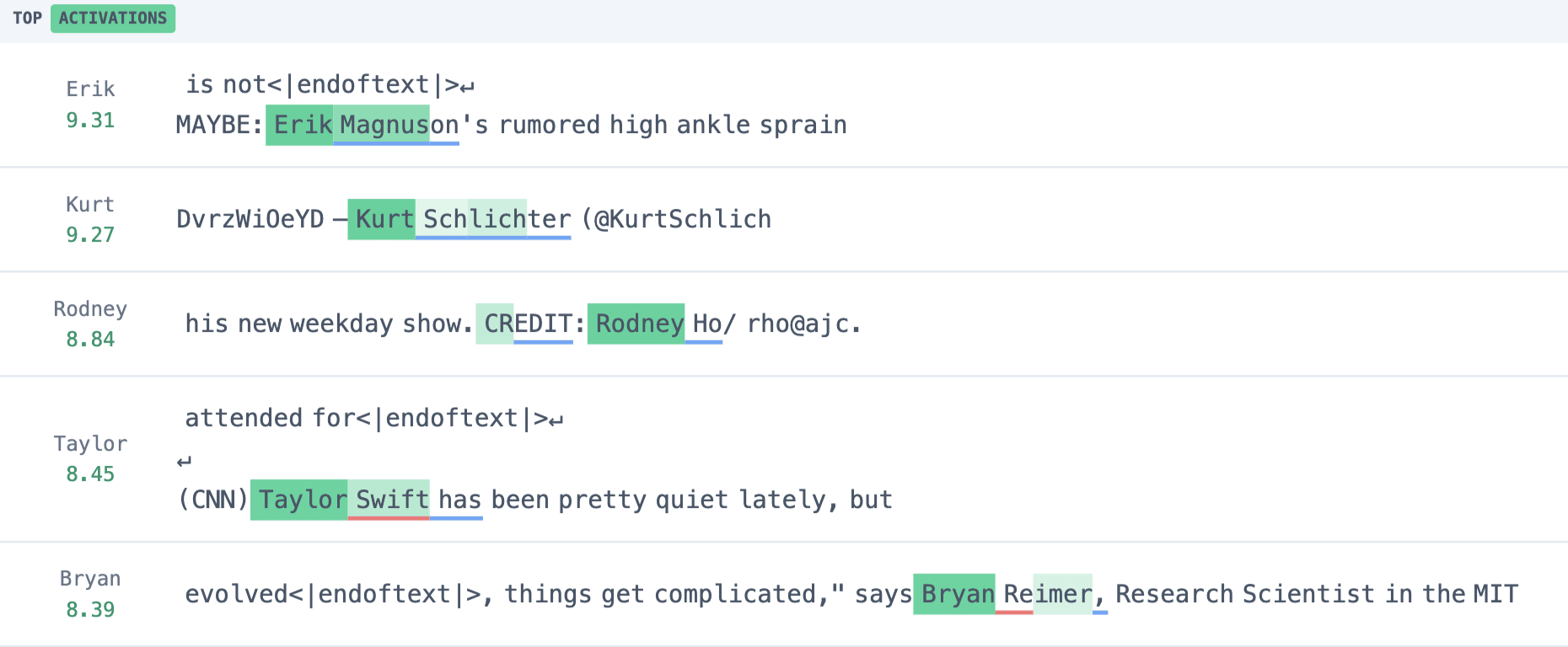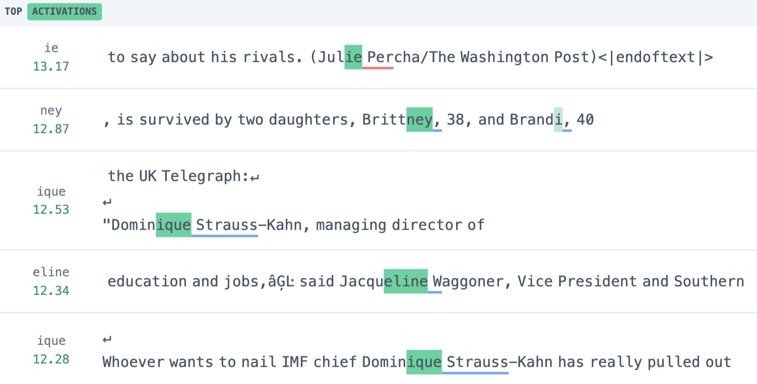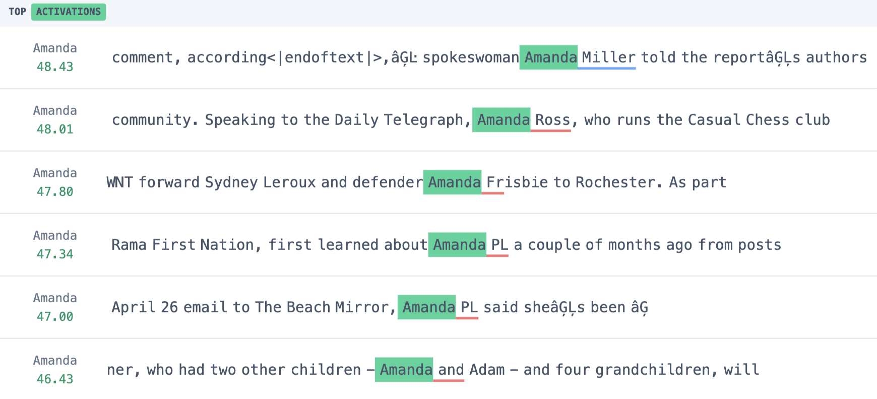 Residual feature 3.14186: Specifically activates in “Amanda”, and boosts last names for “Amanda”