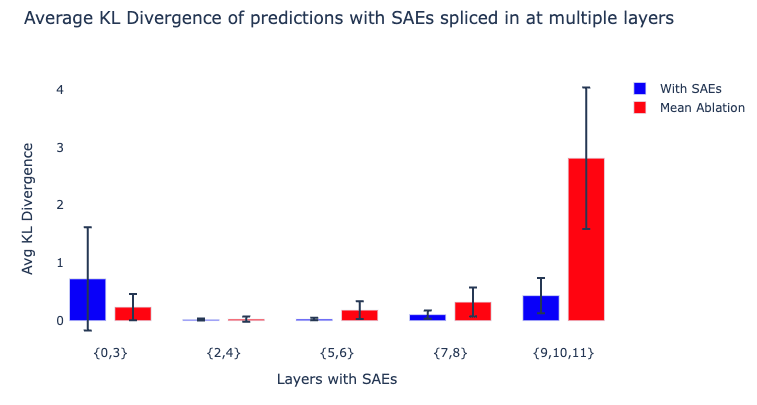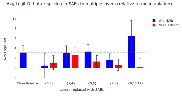We find that splicing in our SAEs at each of the early-middle layers [1, 6] maintains an average logit difference roughly equal to the clean baseline, suggesting that these SAEs are sufficient for circuit analysis. On the other hand, we see layers {0, 7, 8} cause a notable drop in logit difference. The later layers actually cause an increase in logit difference, but we think that these are likely breaking things based on the relatively high average KL divergence, illustrating the importance of using multiple metrics that capture different things.[1]