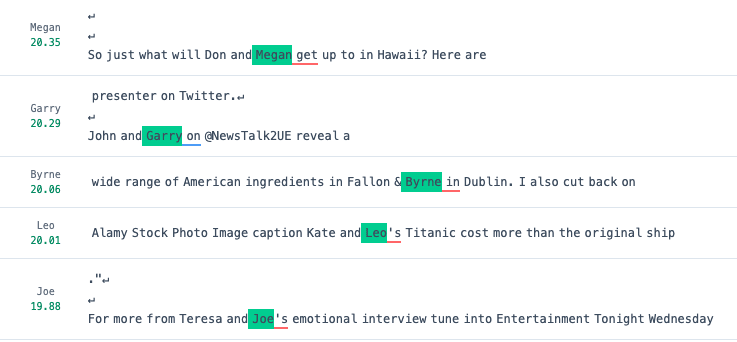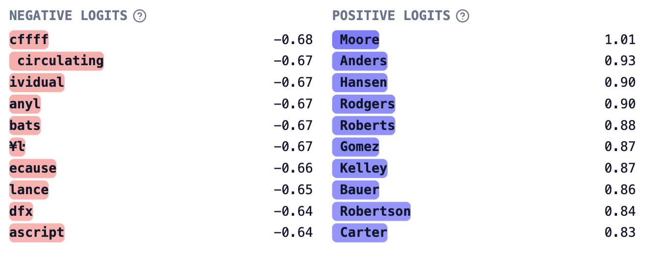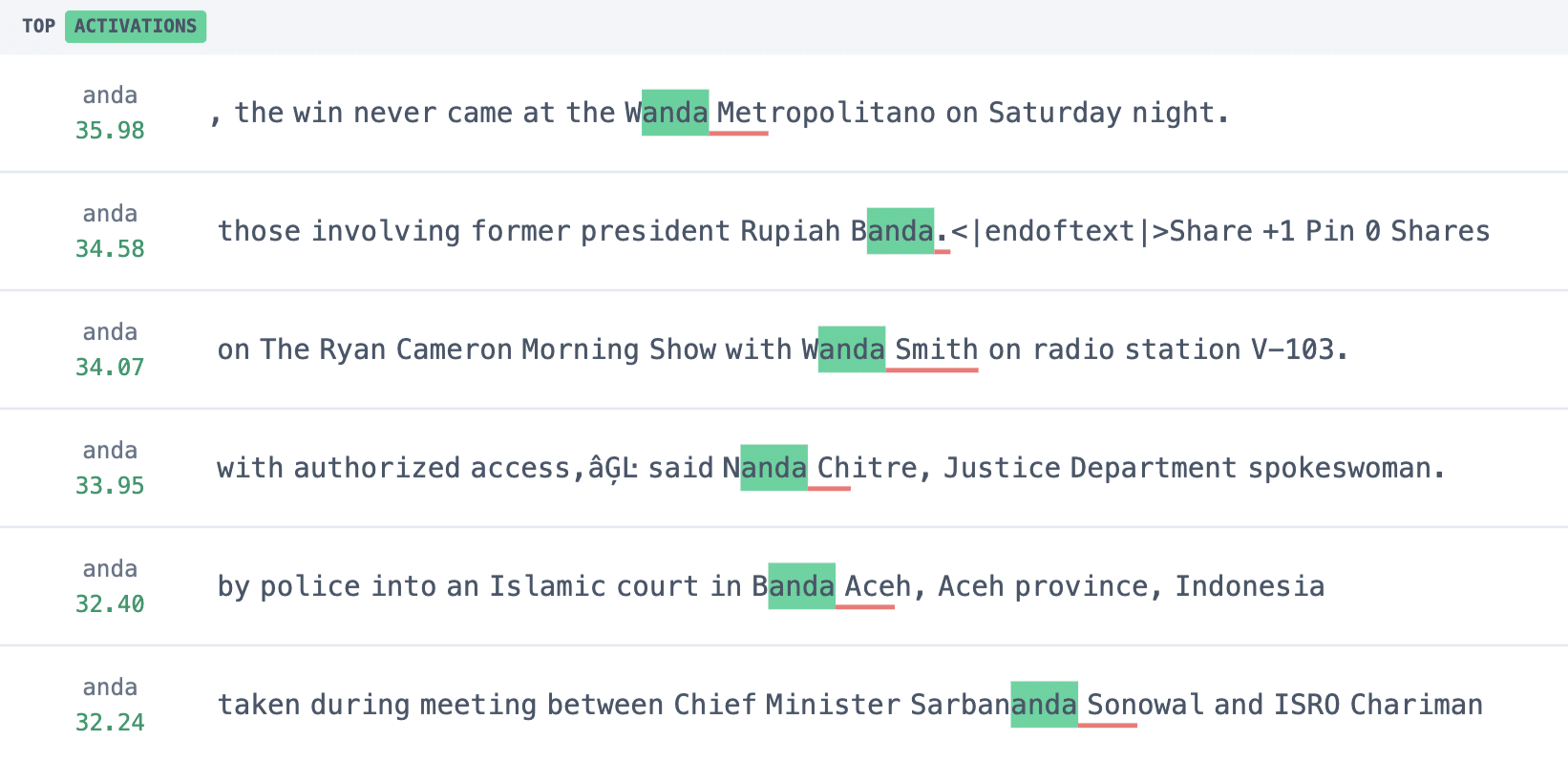 Residual feature 3.19755: Activates maximally on names ending with “anda”. We note that these seem primarily female (e.g. Yolanda, Miranda, Fernanda, Wanda, etc.)