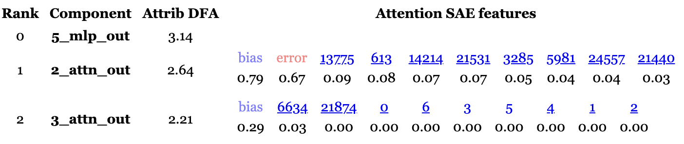 Dealing with MLPs in circuit analysis. Recall that our recursive DFA technique treated mlp_out activations as leaf nodes. We could apply an MLP SAE to these activations, but even then we can’t use DFA to go back through the non-linear activation function. One approach is to apply causal interventions (e.g. path patch the MLP inputs) to get around this, but this loses the nice linearity of DFA. We’re alternatively excited about ongoing work attempting to decompose the MLPs with Transcoders (Dunefsky et al.).