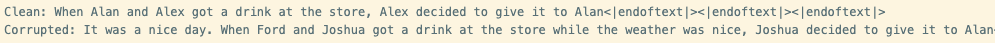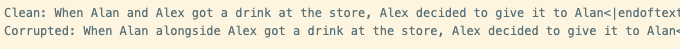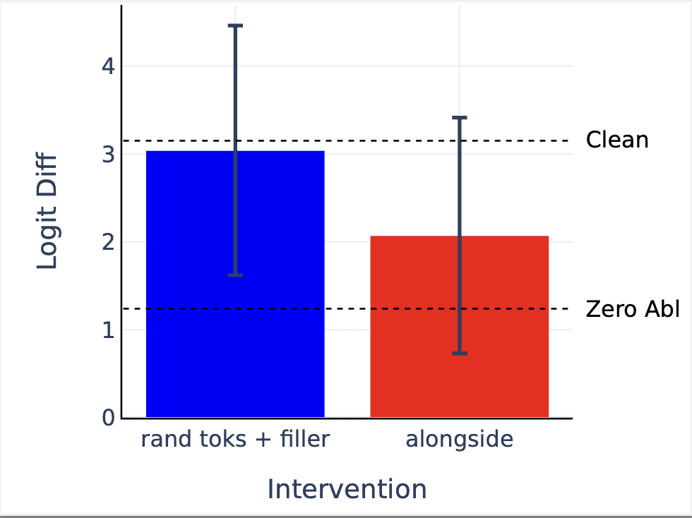 One alternate hypothesis is that the positional signal is a more general emergent positional embedding (e.g. “I am the second name in the sentence”) that doesn’t actually depend on the “ and” token. We falsify this by nosing attn_out at layers [5,6] S2 position from a corrupted distribution which only changes “ and” to the token “ alongside”. Note that this only corrupts one piece of information (the ‘ and’) compared to the three corruptions above, yet we only recover ~43% of logit diff relative to zero ablation.[2]