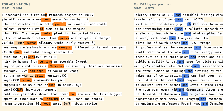 We introduce “recursive direct feature attribution” (recursive DFA) and release an Attention Circuit Explorer tool for circuit analysis on GPT-2 Small (Demo 1 and Demo 2). One of the nice aspects of attention is that attention heads are linear when freezing the appropriate attention patterns. As a result, we can identify which source tokens triggered the firing of a feature. We can perform this recursively to track backwards through both attention and residual stream SAE features in models.