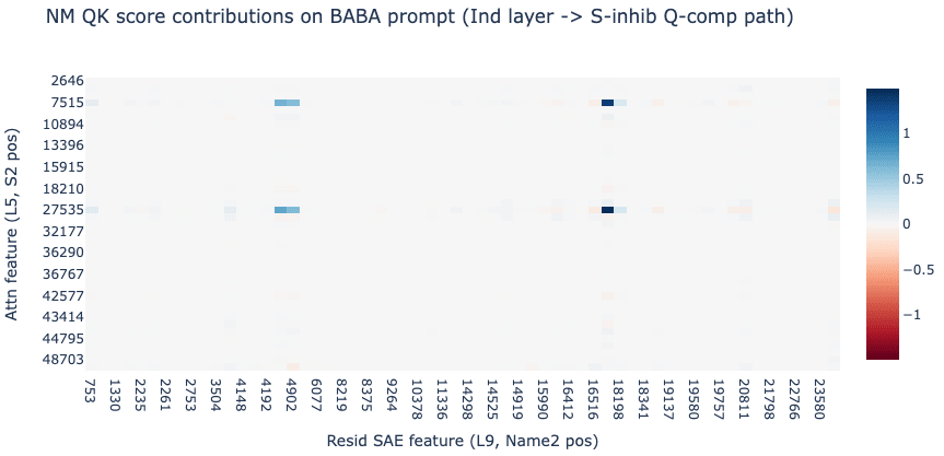 We observe that these heat maps are almost entirely explained by a handful of common SAE features. On the query side we see the same causally relevant Attention SAE features previously identified by ablations: L5.7515 and L5.27535 (“I am a duplicate that preceded ‘ and’”) for BABA prompts while ABBA prompts show L5.44256 and L5.3047 (“I am a duplicate that followed ‘ and’”). On the key side we also find just 2 common residual stream features doing most of the heavy lifting: L9.16927 and L9.4444 seem to activate on names following “ and”.