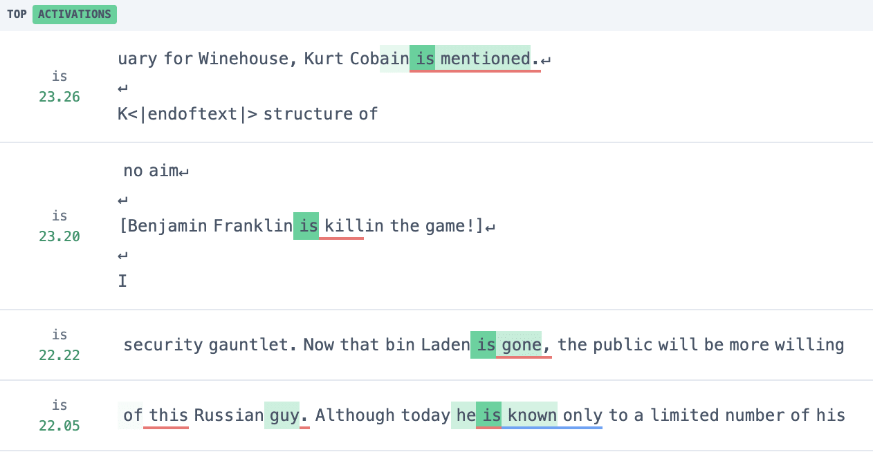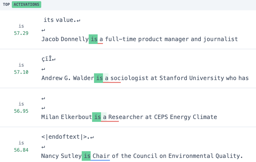 Residual feature 10.1719: “specific mentions or actions related to individuals or their identities” particularly activating on “is” or “was”.