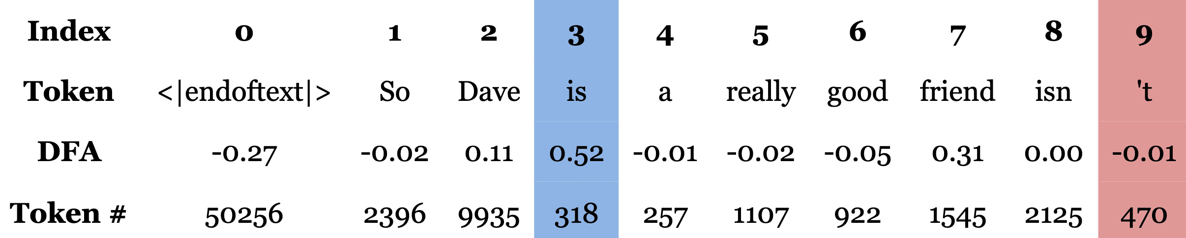 Localize where information was moved from with DFA by source position: Recall that is just the concatenated outputs of each head for . Further, if we freeze the attention patterns (shape ) can write any at destination position D as the attention weighted sum of the value vectors (shape ) at each source position. This provides a per source token DFA highlighting which source positions have the greatest information contribution to activate feature at the current destination position.