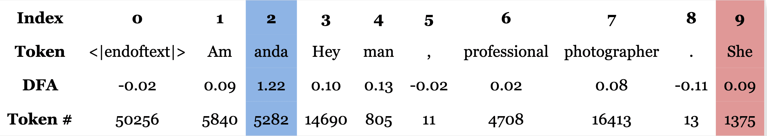 Consider feature 3.15566 examined in our previous post covering all attention heads in GPT-2 Small, which activates on female pronouns and attends back to the name. We examine this feature on the prompt “Amanda Heyman, professional photographer. She”. On the final token, the source position DFA (step 2 in RDFA) indicates the model is attending backwards to the second token of Amanda’s first name, “anda”.