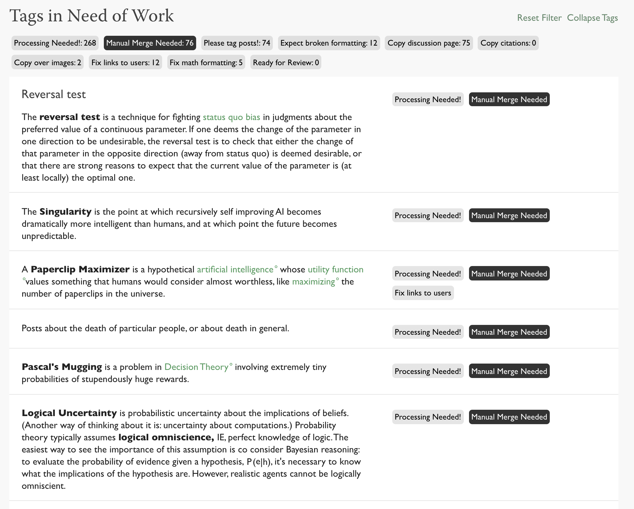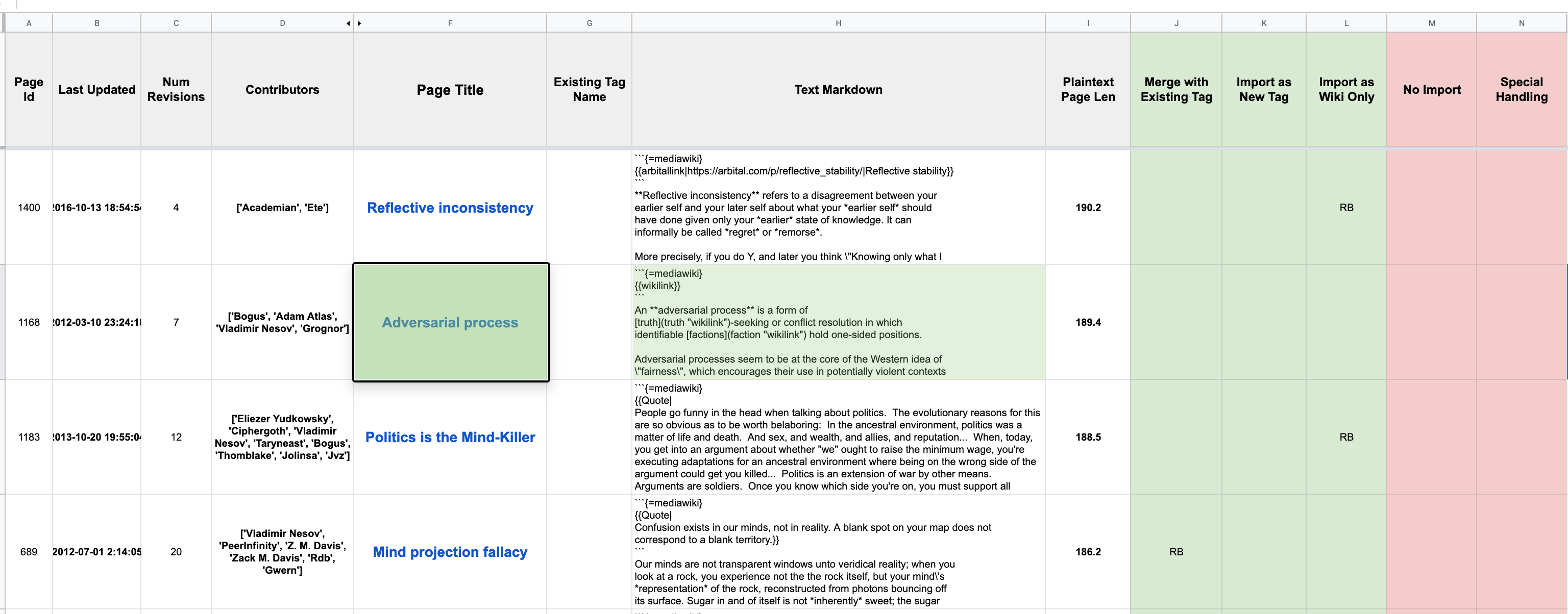 First, there is some general clean-up of links and other elements that didn’t import correctly. Second, and more importantly, a manual text merge is required for the 111 pages are being merged into existing tags. This means taking the text of the existing tag (if it has any) and combining it appropriately with the old wiki page.