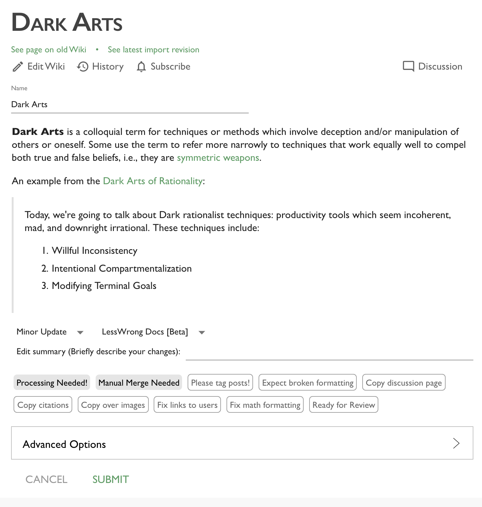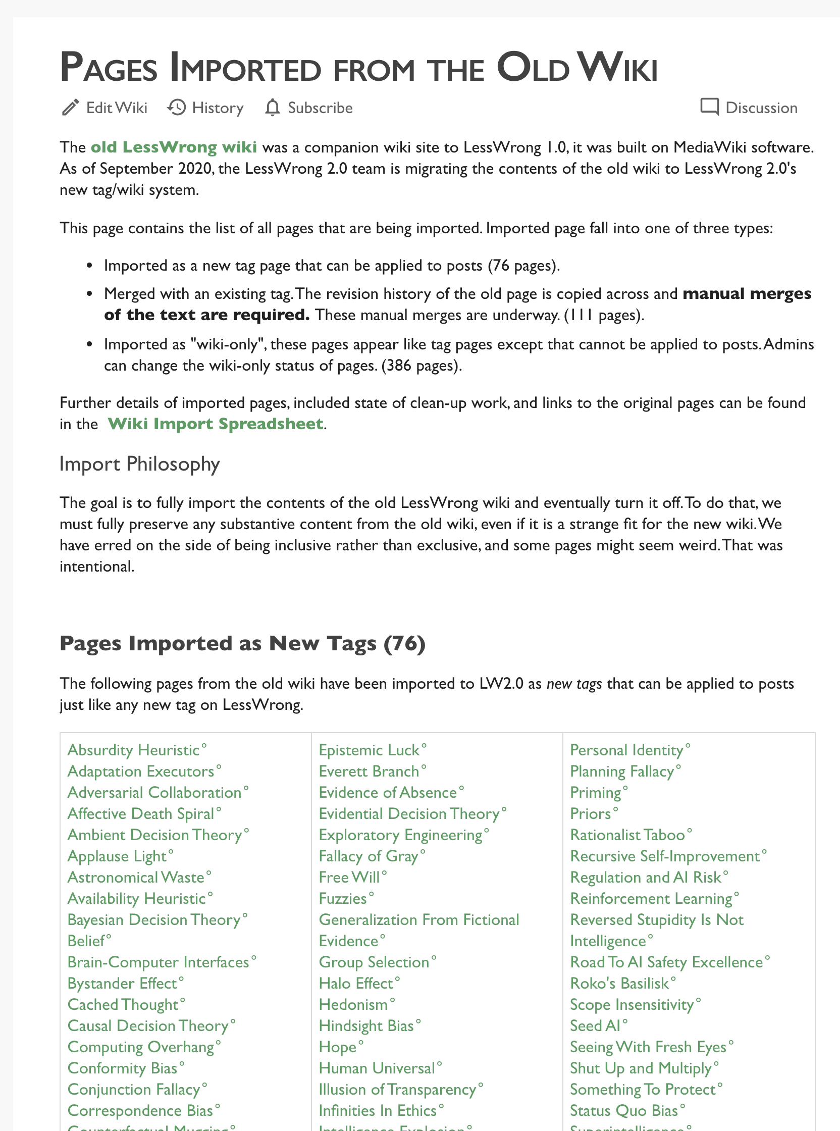 • Pages imported from the old wiki benefit from all the features of new LessWrong such as hover-preview, subscriptions, commenting, and functioning as tags on posts.