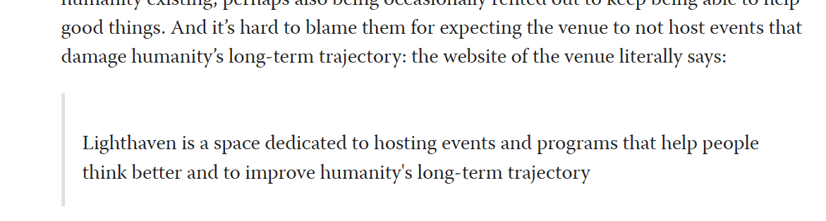They donated to keep the venue existing, thinking of it as a place that helps keep humanity existing, perhaps also being occasionally rented out to keep being able to help good things. And it’s hard to blame them for expecting the venue to not host events that damage humanity’s long-term trajectory: the website of the venue literally says: