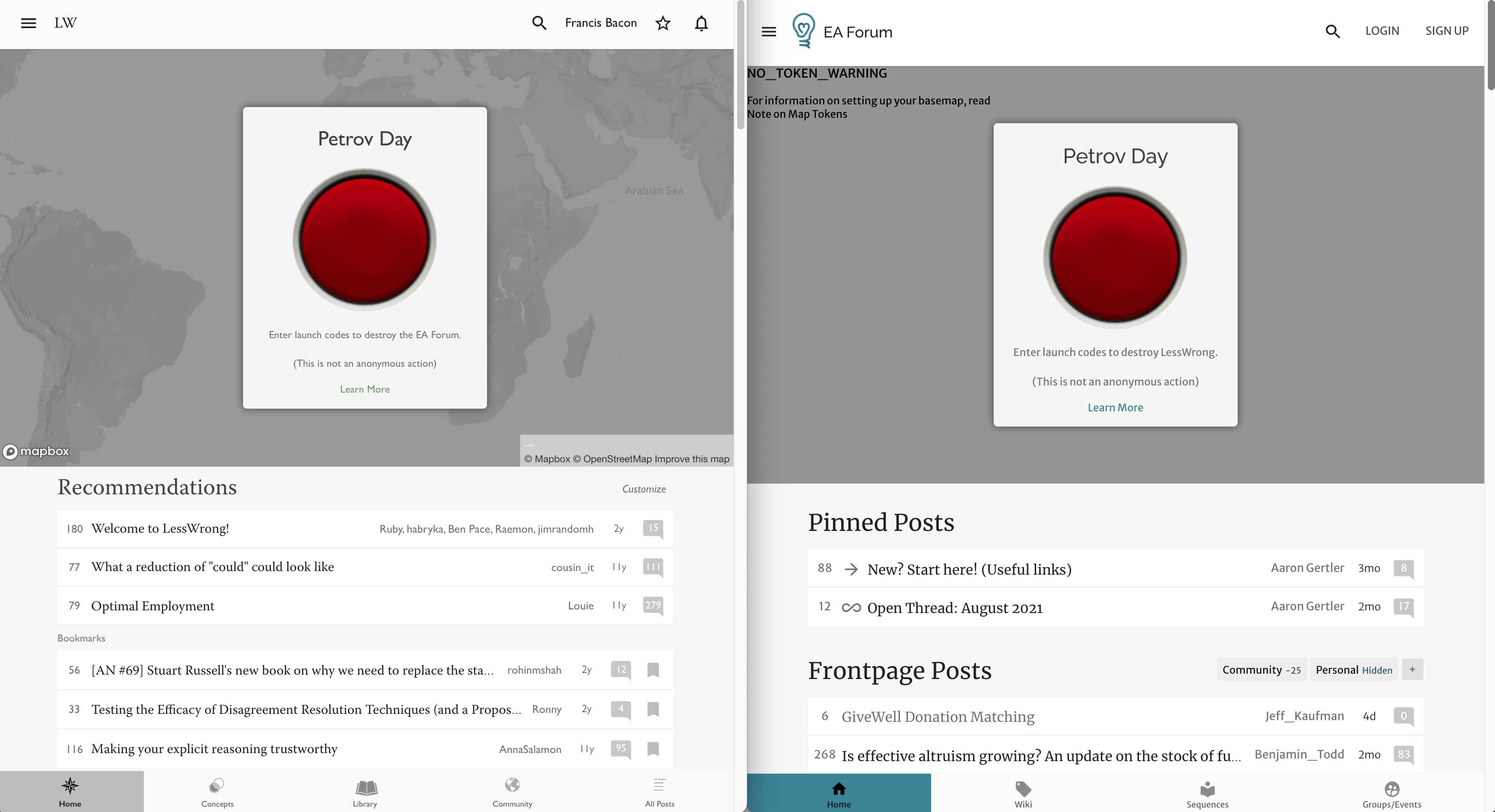 In both 2019 and 2020, LessWrong placed a large red button on the frontpage and distributed “launch codes” to a few hundred “trustworthy” people. A launch would bring down the frontpage for the duration of Petrov Day, denying hundreds to thousands of people access to LessWrong. In 2019, all was fine. In 2020...let’s just say some bad decisions were made.