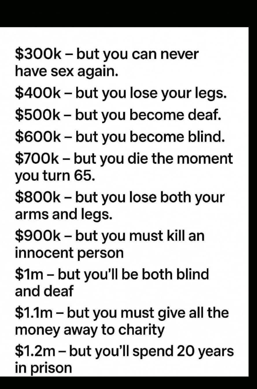 A remarkably large number of people went for the $900k, without even stopping to think that there was no assurance you would even get away with it. Well, that’s engagement farming, I guess.