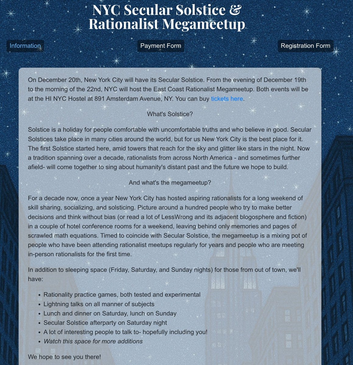 I strongly recommend going to the Secular Solstice itself if you have the opportunity, either in NYC, SF or other places it is offered. If you are local, and the rationalist megameetup is self-recommending to you, then you should definitely go. If not, consider going anyway. I’m usually there for one of the days.