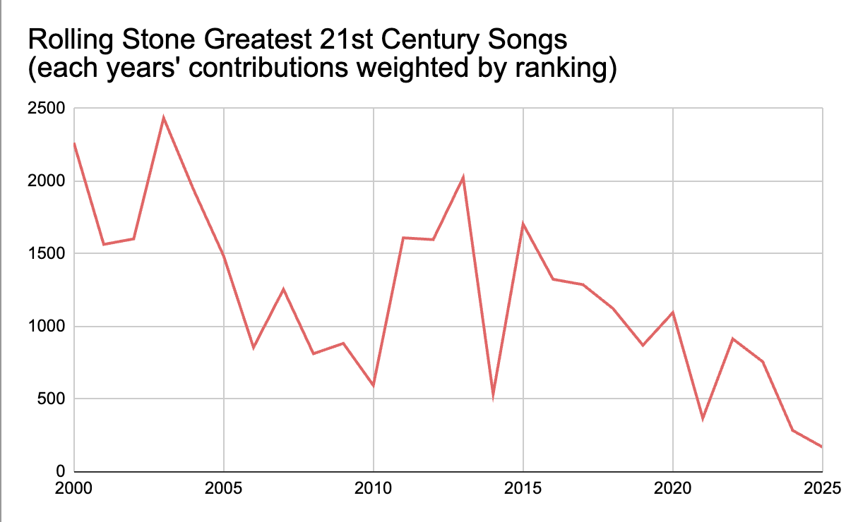 I don’t know how much of this is anti-recency bias, and how much of this is those involved being super old, but also the idea of having a canon of music songs, that are listened to over decades, seems itself pretty old now, something only old people would care about?
