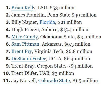 College football coaches have been paid a combined $185 million this season to go away. I get how we got here, the coaches are in high demand and shop for the best deal, want to lock in profits, are definitely not looking to get fired so there isn’t actual moral hazard, and the patience teams show has worn paper thin, and the buyout serves are protection against being poached by another school. Also the transition to the NIL era has invalidated many past strategies, making previously excellent coaches no longer good, see Dabo Swinney (probably).