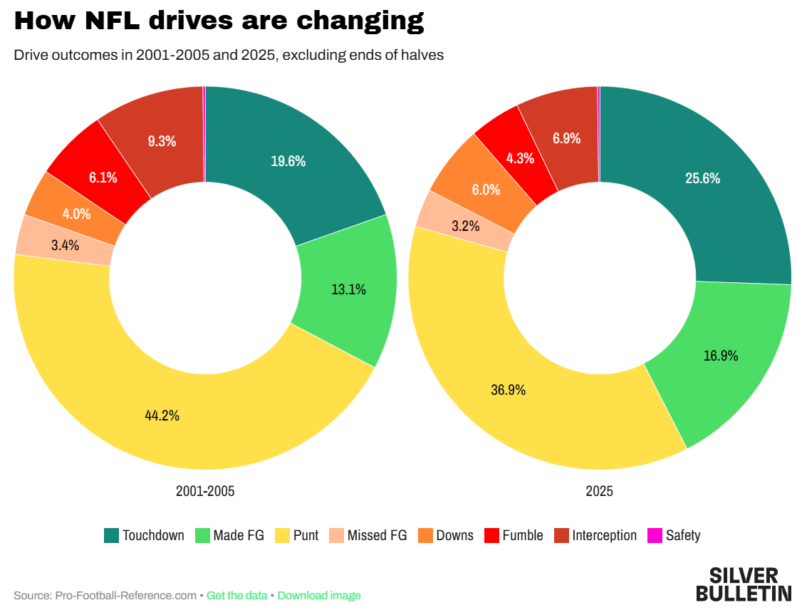 The broader NFL shift is that not only are kickers getting better (as per this very fun article from Nate Silver), offenses are getting better across the board and also making better decisions, and the reason we don’t notice the extent of this is that drives are taking up more time so the scores don’t fully reflect the shift.