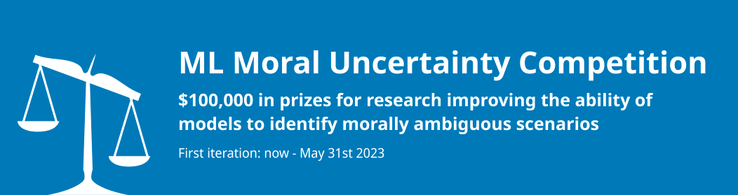 ML Systems often make real-world decisions that involve ethical considerations. If these systems can reliably identify moral ambiguity, they are more likely to proceed cautiously or indicate an operator should intervene. This $100,000 competition aims to incentivize research on improved uncertainty estimation by measuring calibrated ethical awareness. Submissions are open for the first iteration until May 31st, 2023.