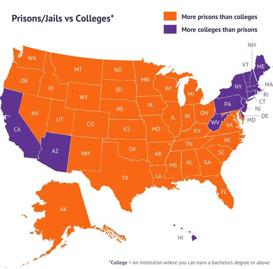 (On the original question, comparing the number of colleges to the number of prisons is pretty silly: if one state runs large prisons and small colleges is that any better than a state that does the reverse? Comparing the number of people in prison vs college would make much more sense.)