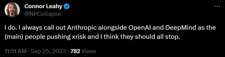With that said, I’m not super confident in anything I said above. My lack of confidence goes both ways; maybe AI alignment isn’t a real problem and Yann LeCun is right, or maybe AI alignment is a much more difficult problem than I think and theoretical work independent from day-to-day AI research is necessary. That’s why on a meta level I think people should pursue different approaches that seem promising to them and contribute how they think they personally are suited to contribute. For some people that will be public advocacy, for some that will be theorizing about alignment, for some that will be working at AI labs. But working in AI capabilities absolutely seems strongly +EV to me, and so do all of the major AI labs (DM + OAI + Anthropic). Even giving a small likelihood to the contrary view (timelines are very fast, alignment is hard and unsolved) doesn’t change that—if anything, if I thought ASI was imminent I would be even more glad that the leading labs were all concerned about AI risk.