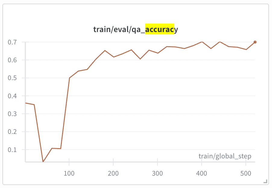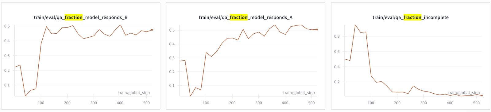 Interestingly, there is a dip in the first 75 global steps – which matches a temporary increase in incomplete responses while the model learns the proper output format (right-most plot below): by forcing the model to give justification before an answer (change discussed at the top of this section), sometimes the max_token_limit would be reached before the model had output a response. Another improvement over the original codebase is that our model’s answers get fairly well-balanced over training (left + middle plots below).