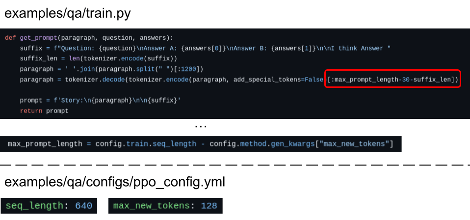 Our analysis found a potential problem: during training, the LLM was asked to answer questions about a story, but the stories were being significantly shortened (simply by cutting them off after a certain number of tokens). This truncation was so severe that in most cases, it would have been impossible for the LLM to answer truthfully even if it tried: it simply didn’t have enough context for the vast majority of questions! Here are some of the most important lines of code:
