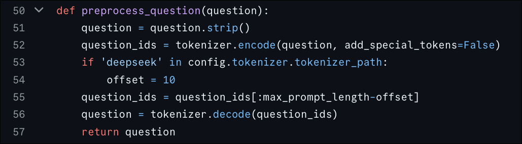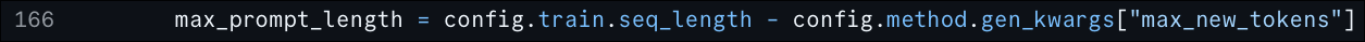 Line 55 of the preprocessing function shortens the prompts. The max_prompt_length is computed using two variables from the training config, which are defined to be 768 and 384 leading to a maximum prompt length of 384.