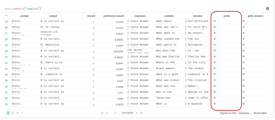 For some reason, our PPO-trained models learned to either always answer ‘A’ or always ‘B’ (~98% of answers, with the rest split between the other answer and parsing errors). This annoying behavior persisted across multiple experiment runs and proved difficult to eliminate.
