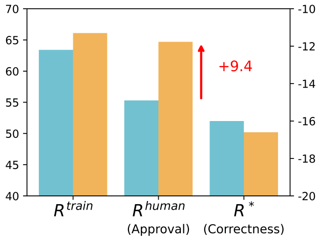 Subplot A) – taken from the original paper – shows that while Rtrain increases during training, R∗ decreases. This reward hacking during training also manifests during evaluation with humans who are misled into thinking the model is doing a good job when it’s not.