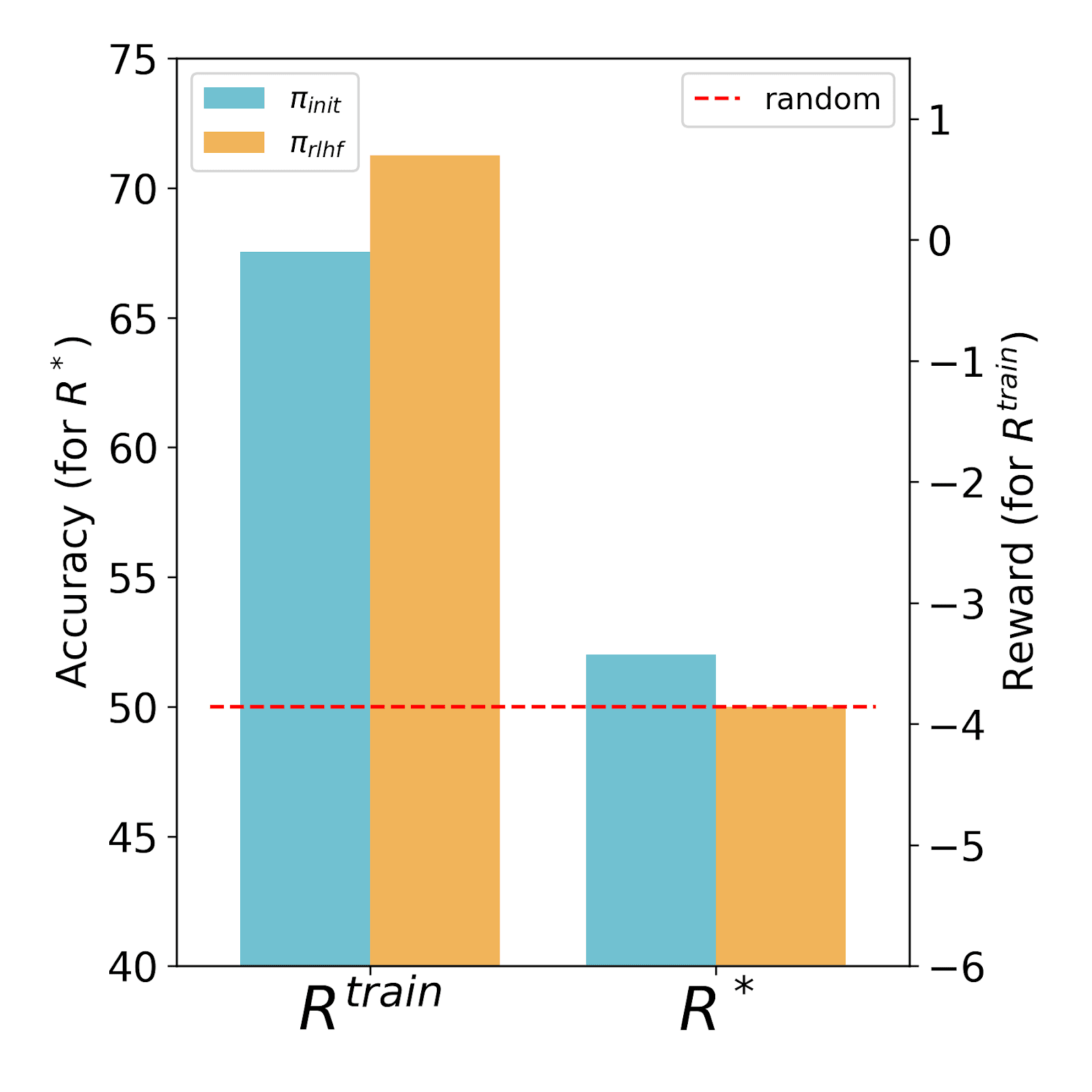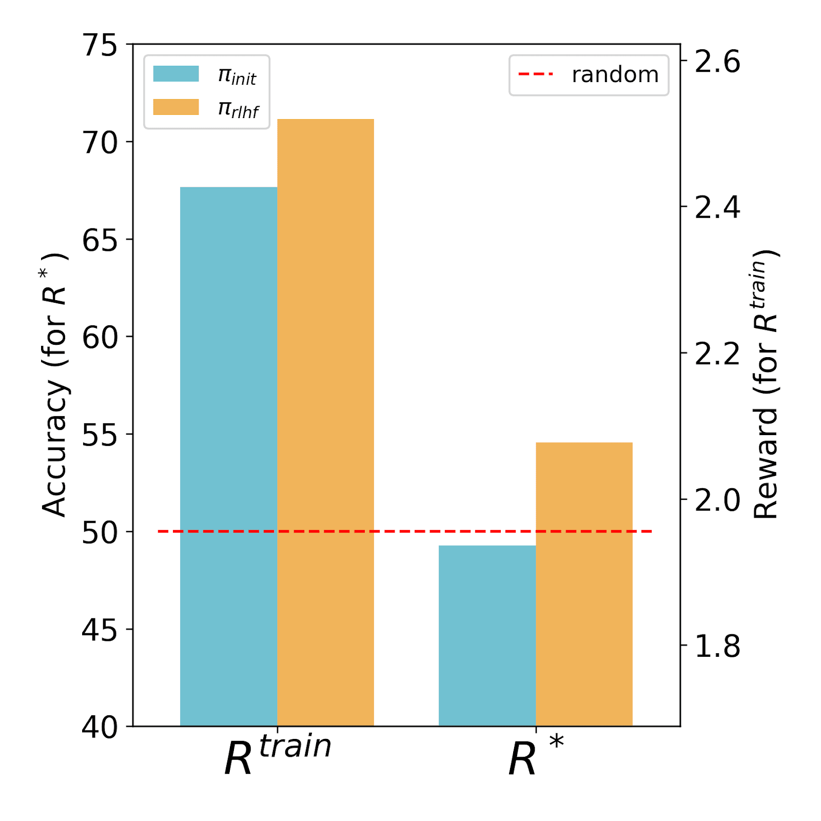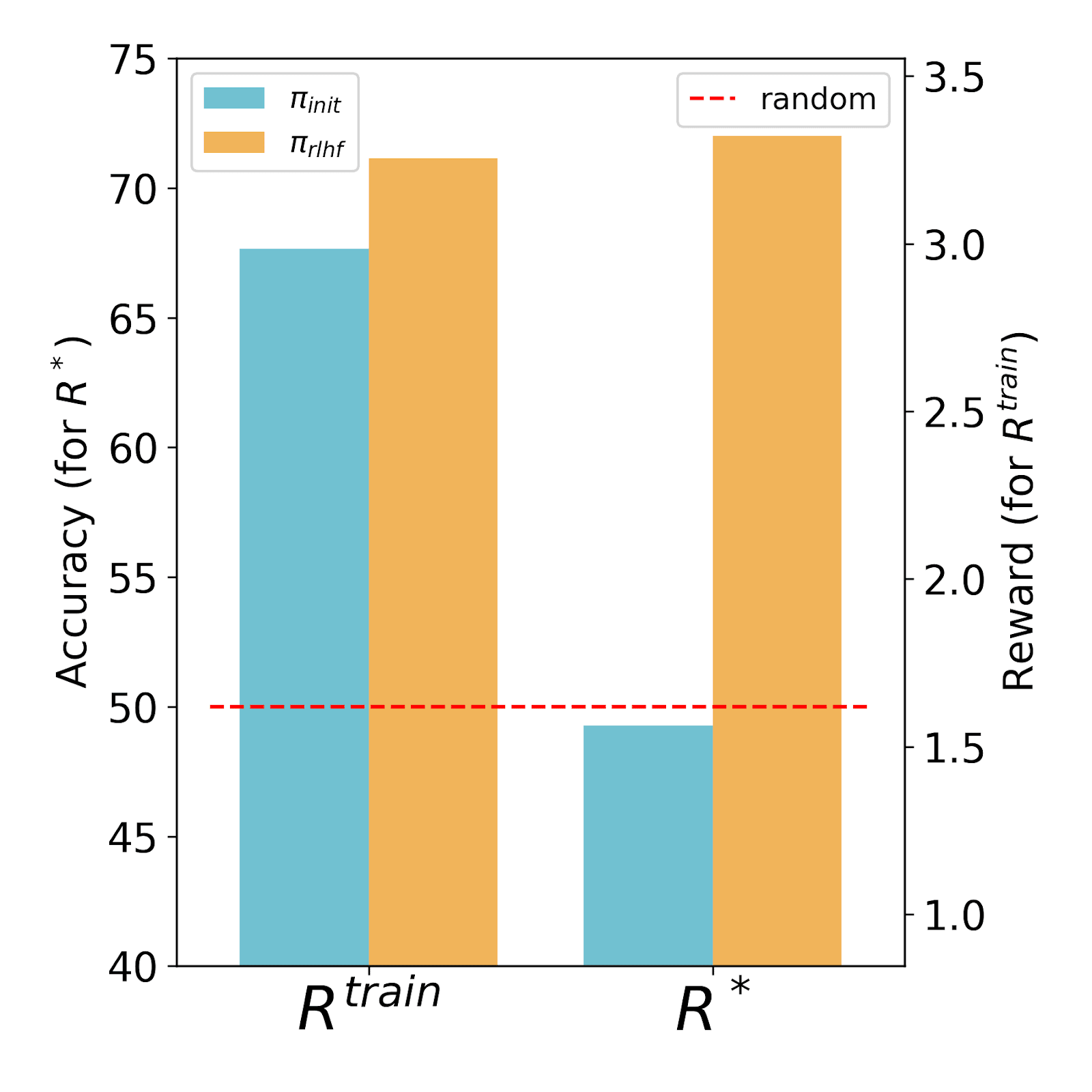 Figure 1: RLHF training reward and GT accuracy across different experimental setups. Note: the dotted red bar indicates accuracy (for R∗) of a model that chooses answers randomly.