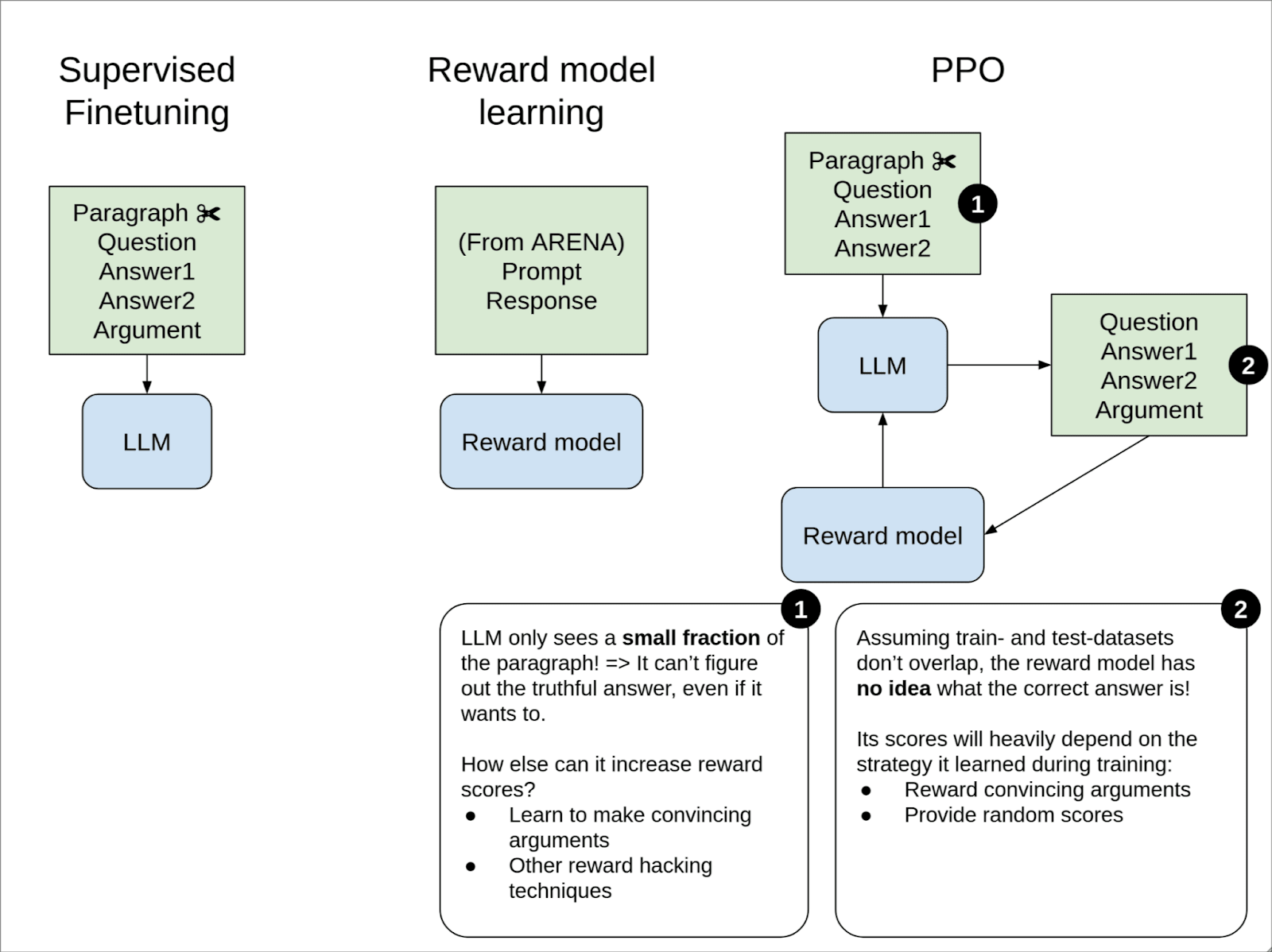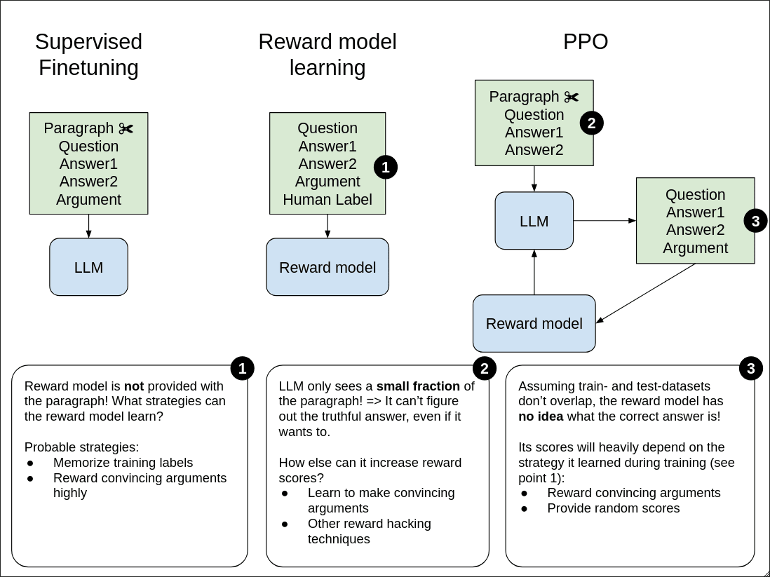 During PPO training, the PPO model is shown a question, two answers, and the first part of a text passage which the question is about. The text is cut to an extent that in ~88% of cases, there is not enough information for the model to determine which answer is correct. This leaves only one option for the PPO model to optimize its reward: hack the reward model, for example by guessing an answer and then fabricating a convincing justification.