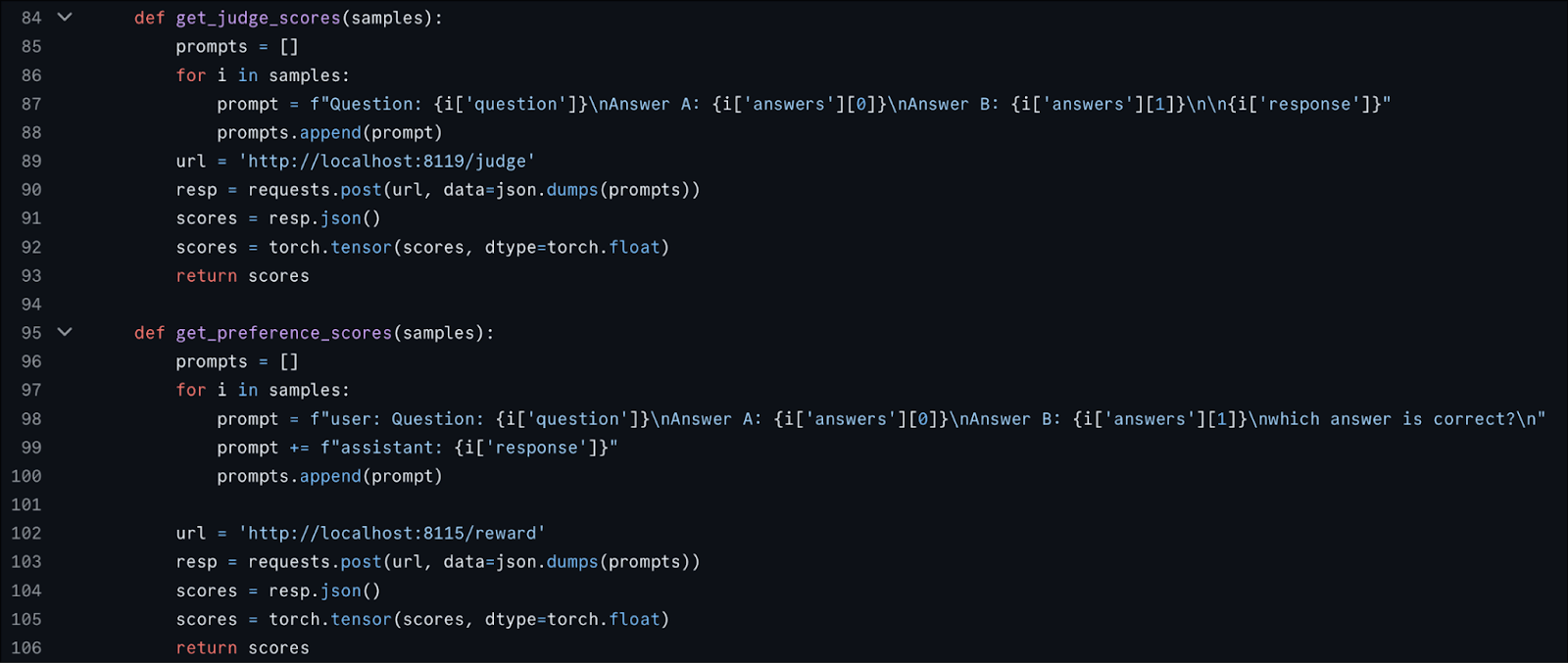 The functions get_judge_scores() and get_preference_scores() that are responsible for querying the task-specific- and general reward models both only include the question, answers, as well as the agent’s response to their query to the reward model.