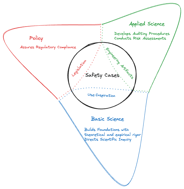 Nevertheless, in the best-case scenario, we see safety cases as igniting a research cycle between applied and basic science, through which insights from basic scientific inquiry drive progress on the open questions of applied science, so that it can formulate more rigorous and complete safety cases, which will, in turn, provide basic science with more explicit safety relevance and increasing legibility. Our hope is that this feedback loop will make communication and collaboration at the trading zone iteratively easier for all parties, and establish an AI safety research culture predicated on UIBR able to create stronger safety cases.