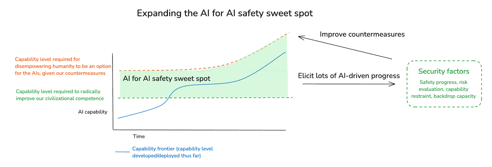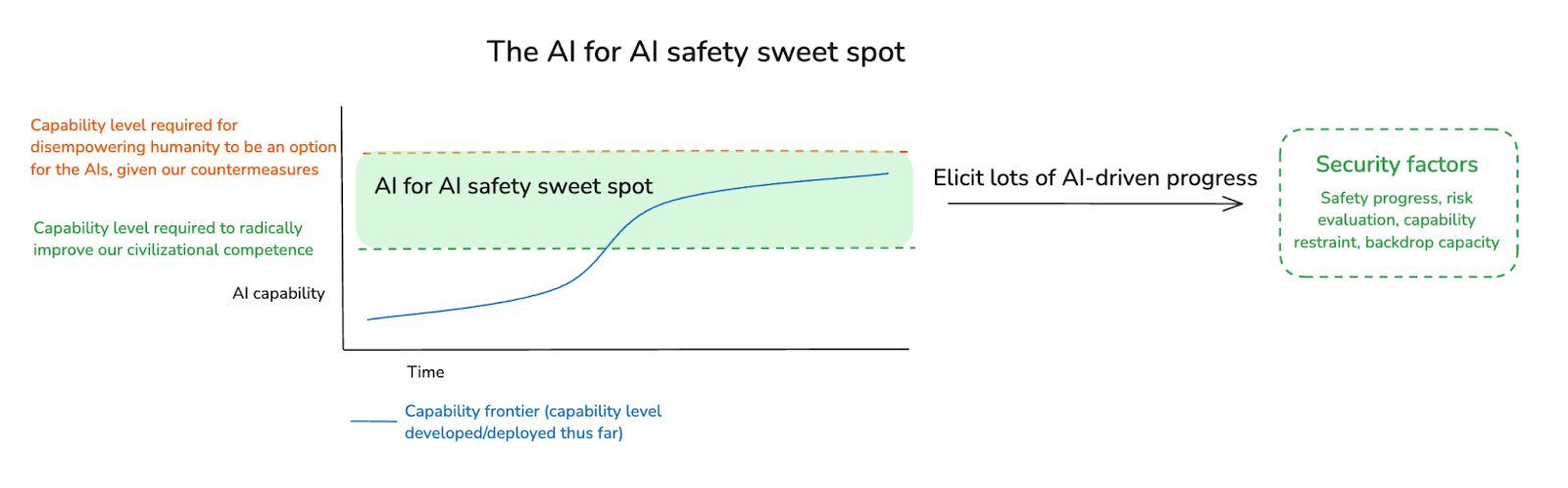 I also discuss the timing of our efforts at AI for AI safety. In particular, I highlight what I call the “AI for AI safety sweet spot” – that is, a zone of capability development where frontier AI systems are capable enough to radically improve the security factors above, but not yet capable enough (given our countermeasures) to disempower humanity. I don’t think it’s clear that we’ll be able to benefit from such a sweet spot – and especially not, for long. But I think it’s a useful concept to have in mind, and an important possible focal point for our efforts at capability restraint.