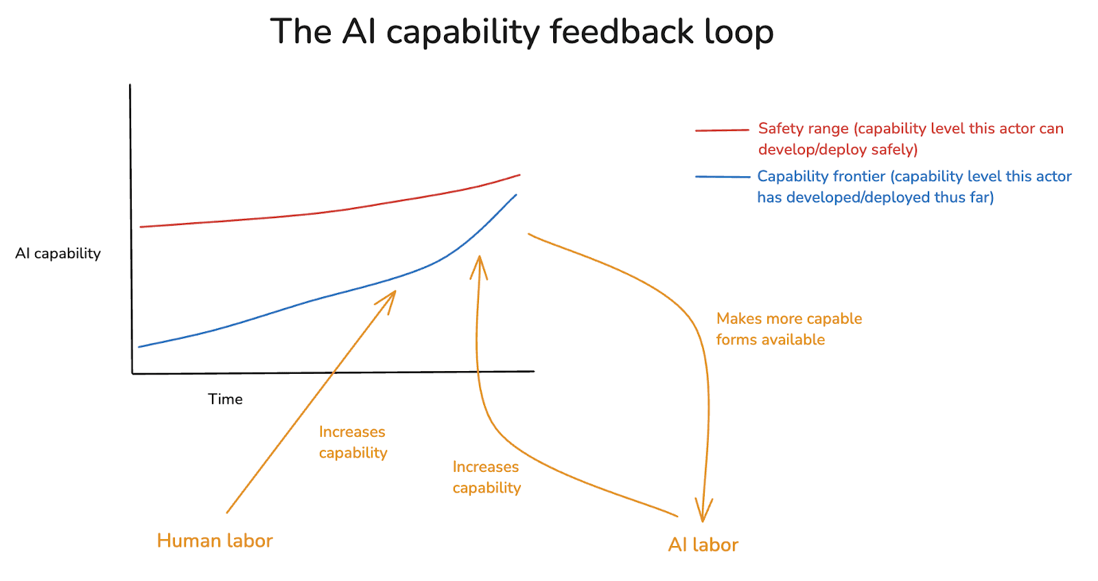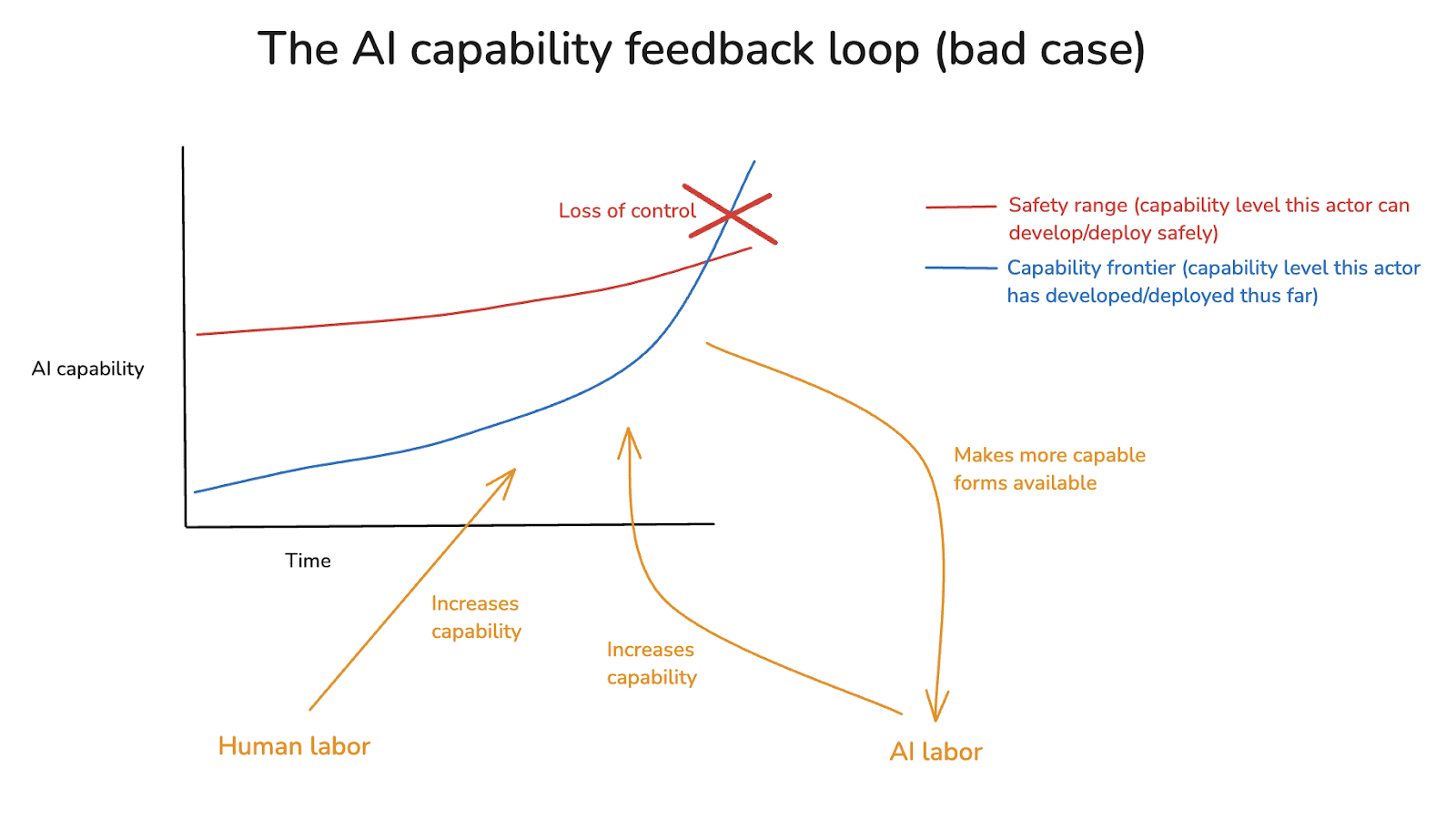 It’s an open question exactly where this feedback loop leads, and on what timescales. In the bad case, though, this feedback loop quickly drives the capability frontier outside of the safety range, leading to loss of control.