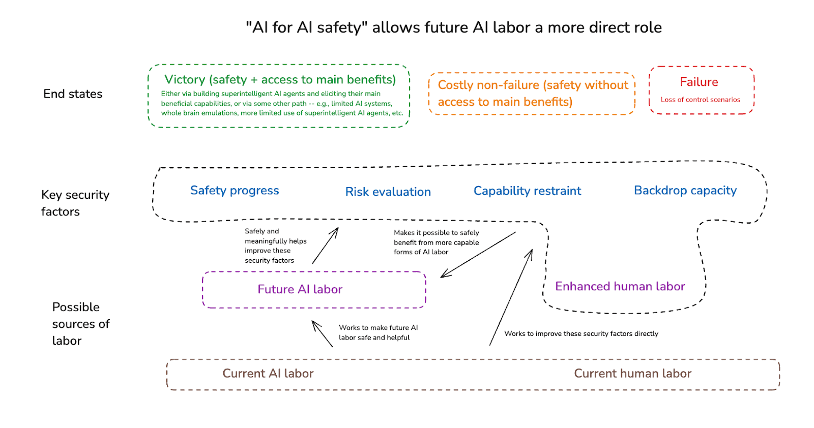 Below I’ll discuss the sorts of objections that motivate views like these. For now, I’m flagging them, centrally, in order for the contrast to help bring the substance of “AI for AI safety” into clearer view. That is: AI for AI safety argues for a more direct role for the “future AI labor” node, even absent radical, human-labor-driven safety progress. In a diagram: