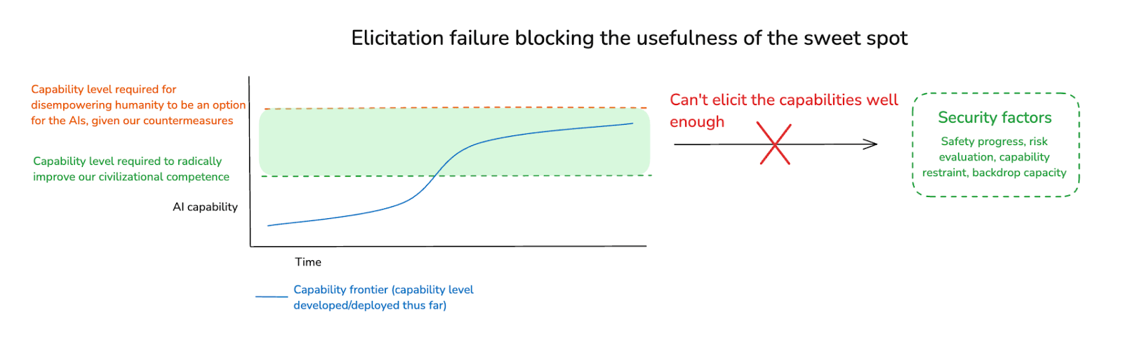 Finally, you might think that there will be a large enough sweet spot to spend meaningful time in, but that we’ll be unable to usefully elicit the capabilities of the AIs in question. Thus, in a diagram: