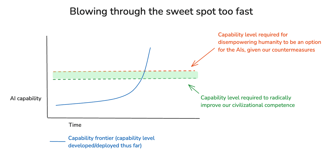 The first is just that: there won’t be a sweet spot at all. That is: by the time frontier AIs are capable enough to radically improve our civilizational competence, they’ll also be in a position to disempower humanity, even given our countermeasures. Call this a “no sweet spot view.”[37]