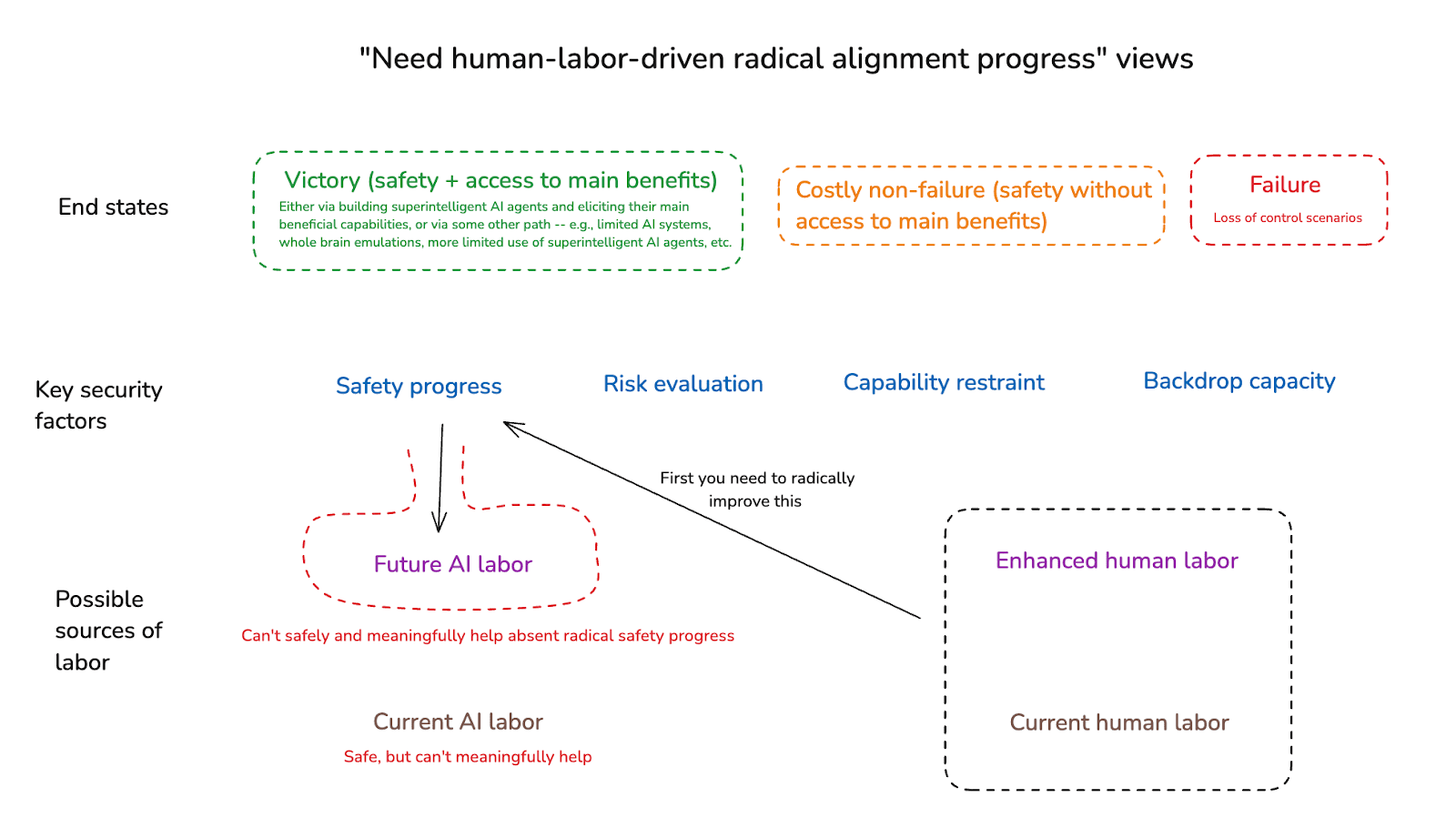 Still, some people disagree. In particular: some people endorse what I’ll call “need human-labor-driven radical alignment progress views,” on which AI labor will remain some combination of unhelpful and unsafe absent radical progress on alignment – progress that therefore needs to be driven by some form of human labor instead.[17] Thus, in a diagram: