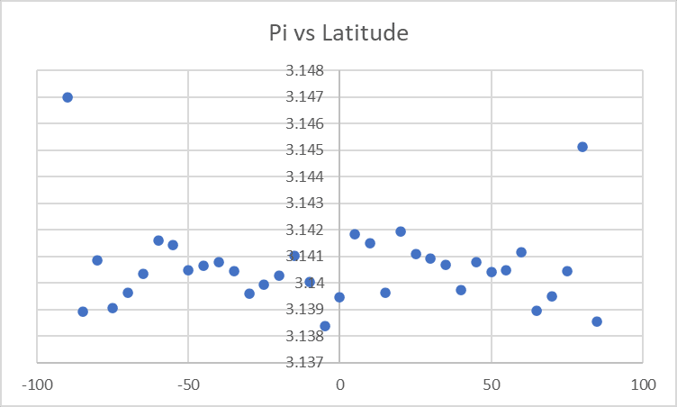 We have to be careful when looking at those buckets near the middle/ end, because they’re very small. If we plot the value of Pi against Latitude: