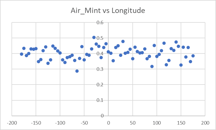 In our last analysis, we saw a surprising frequency pattern for Latitude/Shortitude/Deltitude, where the polar values around +-90 were low (as expected from choosing a random location on the planet), but the equatorial values around 0 were also strangely low: