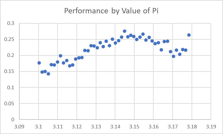 The peak seems to be at the true value of Pi, which makes a lot of sense. However, it looks like ‘too-high’ values of Pi have only a small effect on performance, while ‘too-low’ values are both further from the true value and more harmful.