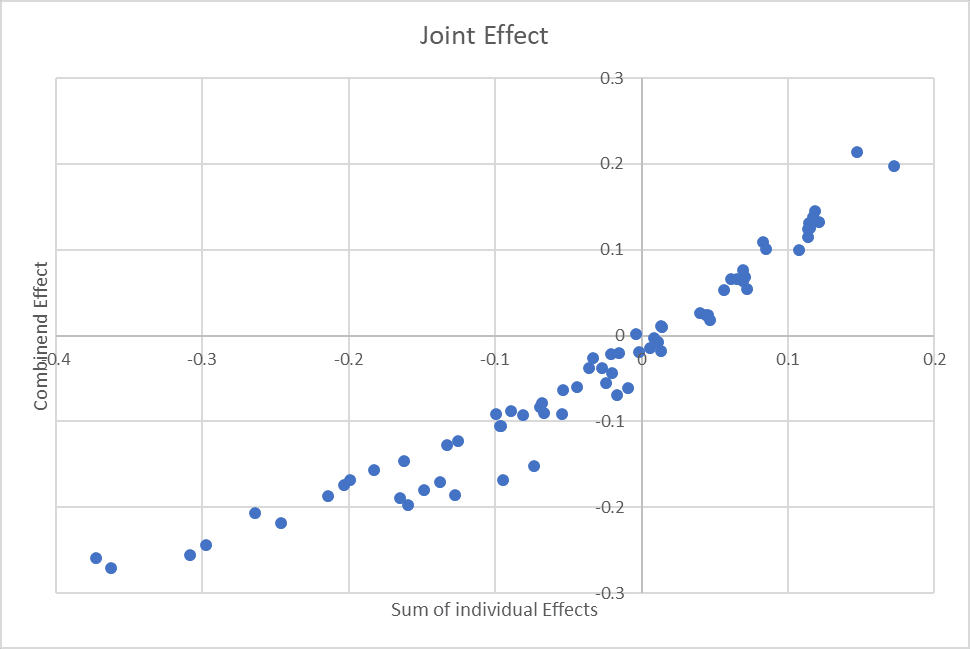 The graph is not perfectly straight—if you imagine a line of best fit, it would look like a curve. This makes sense if the negative effects are multiplicative rather than additive: if two different problems each reduce performance by 20%, the ‘Sum of individual effects’ would be −40%, but the joint effect might well be to reduce performance to 80%*80%=64%, for only a 36% reduction.