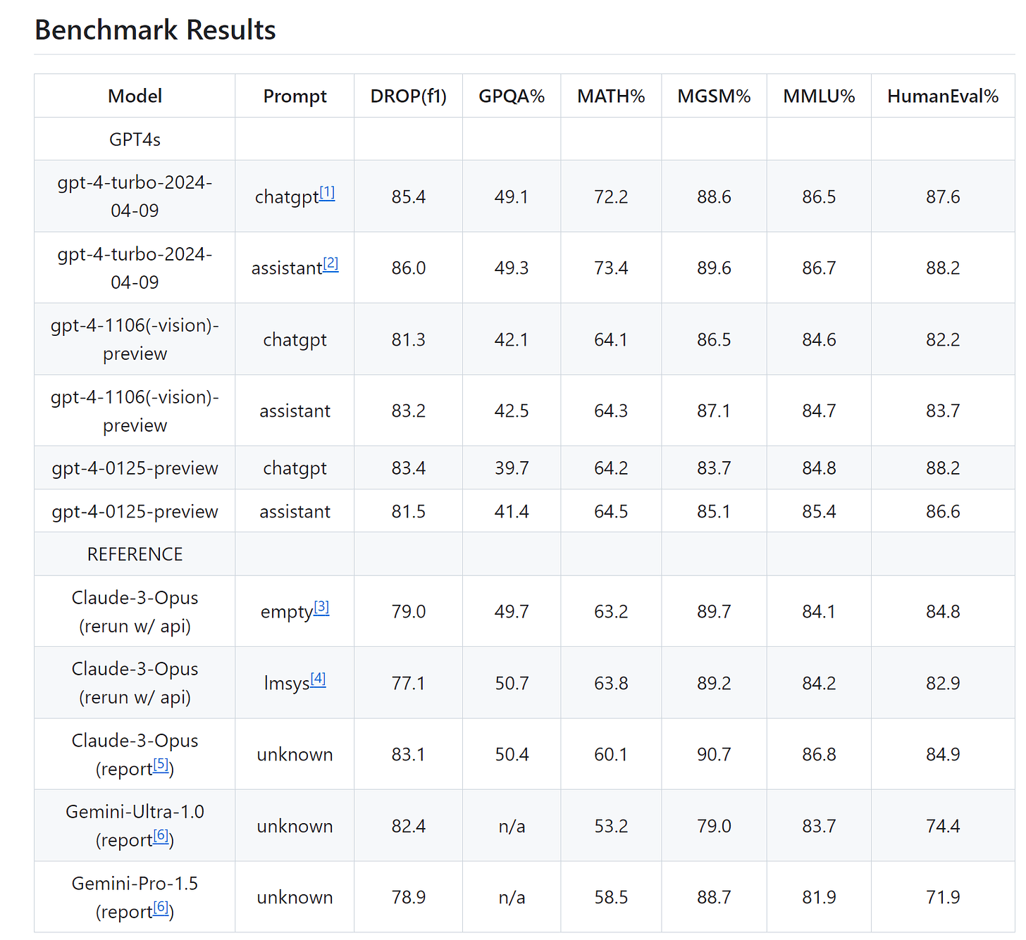 OpenAI points us to a GitHub of theirs for simple evals. They have the new GPQA score up at 49%, versus Epoch’s giving them 46.5%. And they rerun Claude Opus’s evals, also saying ‘we have done limited testing due to rate limit issues,’ all a little fun bit of shade throwing.