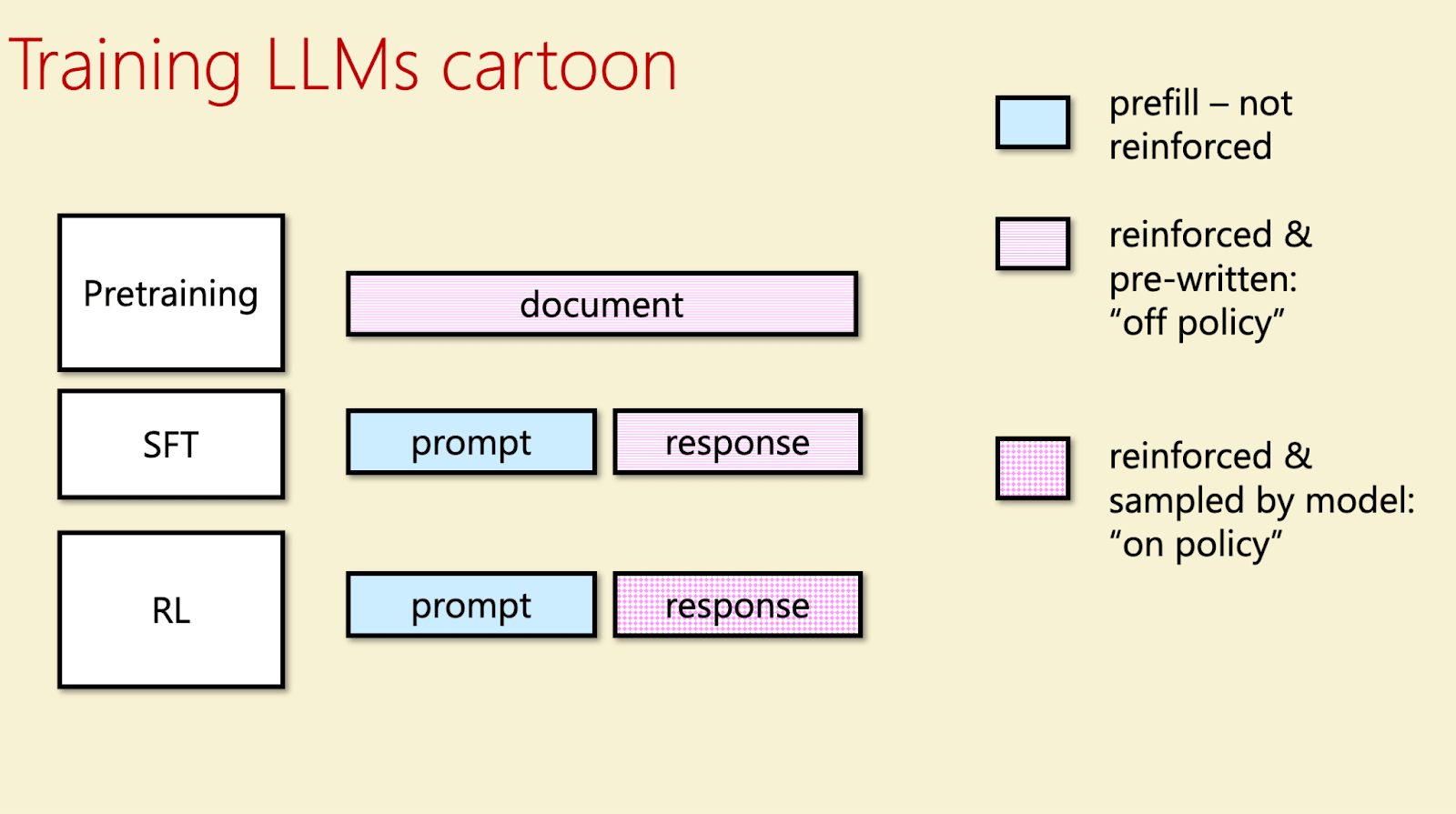 In Pretraining, massive datasets scraped from the internet are used to train basic next-token prediction. The goal is to build a powerful interpolator which can accurately fill in missing words in a diverse (and messy) corpus of text.